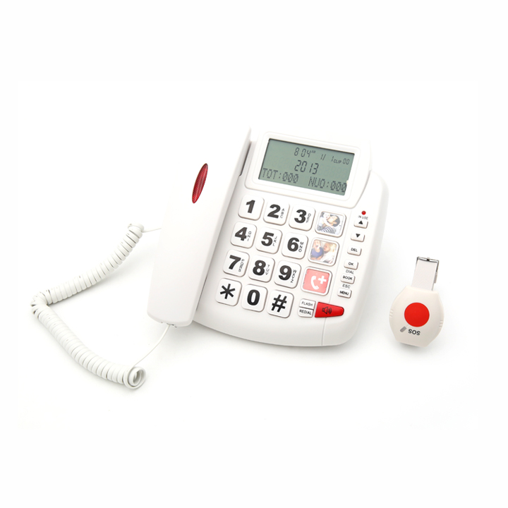 El teléfono de emergencia Beawin SOS está diseñado para proteger a su familia y evitar accidentes. Funciona como un teléfono fijo común pero tiene el control remoto SOS en caso de emergencia. Hasta 5 colgantes inalámbricos que pueden llamar automáticamente hasta 10 números de emergencia desde una distancia de hasta 100 pies de la base. También cuenta con timbre y auricular aptos para audífonos, pantalla grande con retroiluminación azul, altavoz manos libres, respaldo de batería. Puede activar una llamada al 911 si usted o su ser querido no pueden comunicarse con el teléfono. También es compatible con varios idiomas y tiene tres botones de imagen de un solo toque con una función de marcación automática de emergencia y existe la posibilidad de responder una llamada con el control remoto.